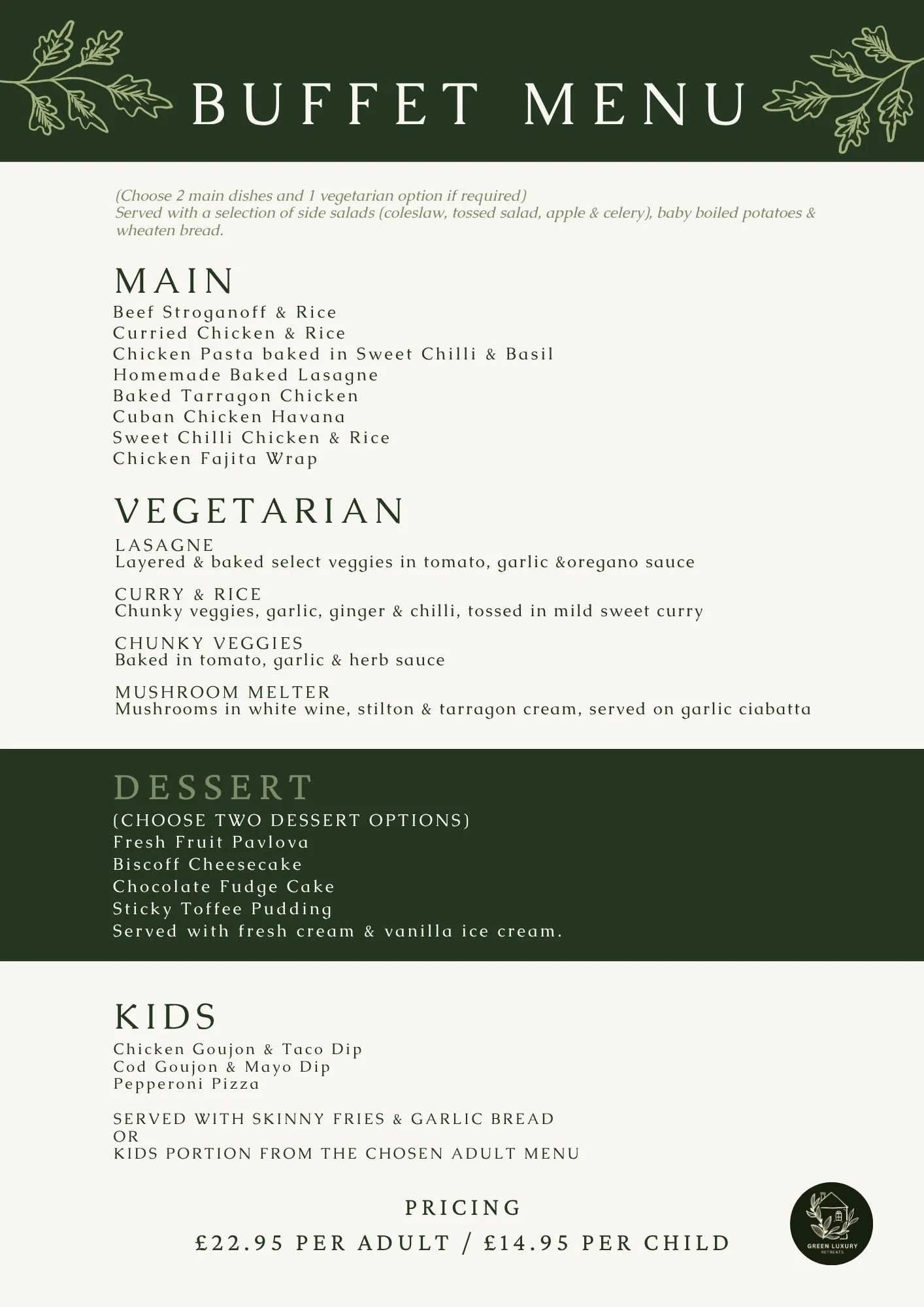 Catering options are available, including a private chef or buffet service